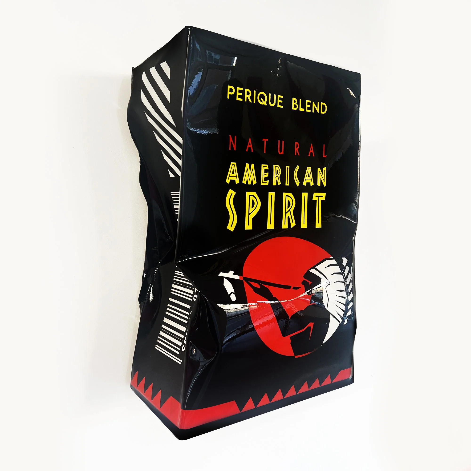 Crush your Spirits evokes feelings of the all natural and expansive American West. The shape explores themes of typography, shape and form. The sculpture shows a glossy exterior finish over black. This sculpture shows a playful balance of style with minimal color pallet. Piece hangs on a stainless steel cleat.