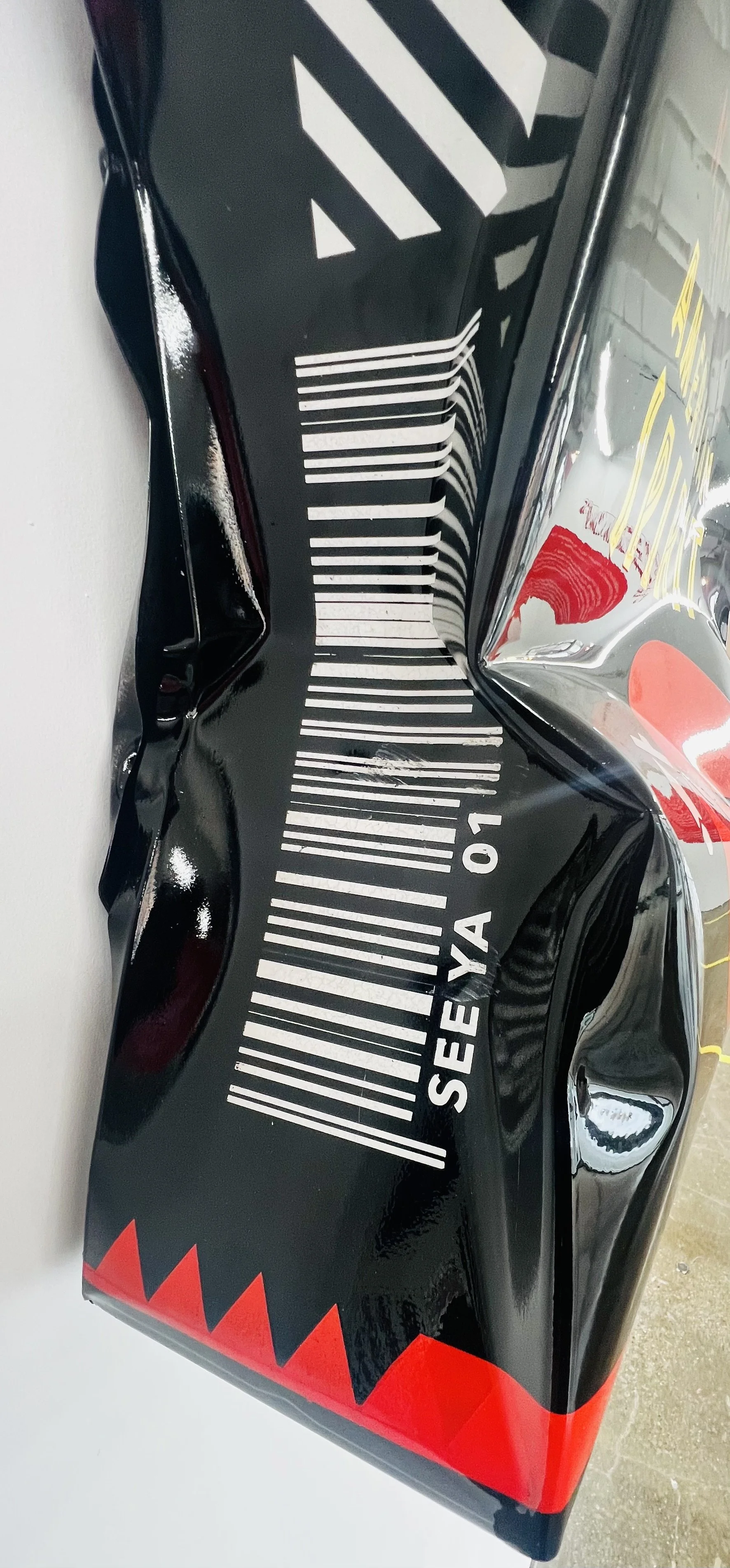Crush your Spirits evokes feelings of the all natural and expansive American West. The shape explores themes of typography, shape and form. The sculpture shows a glossy exterior finish over black. This sculpture shows a playful balance of style with minimal color pallet. Piece hangs on a stainless steel cleat.